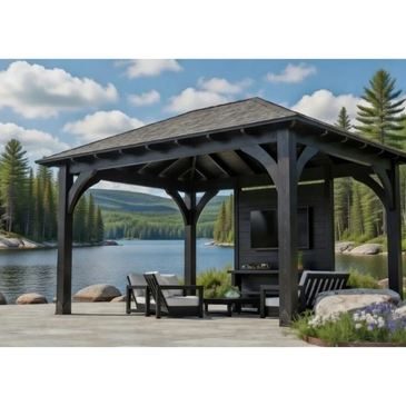 Each pavilion can be finished in a curated range of premium stain colours—from deep Black Ash to soft Dove Grey—allowing you to tailor the look to your property’s style and surrounding landscape. These finishes highlight the natural grain of the wood while providing long‑lasting protection against Muskoka’s four‑season climate.